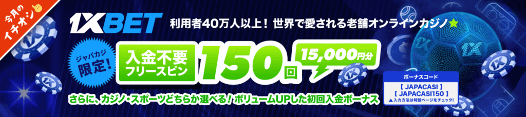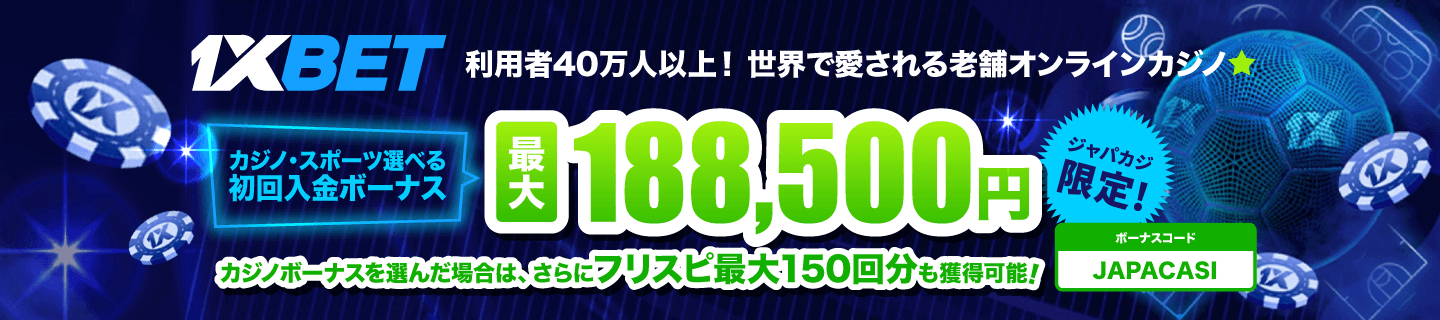 1xBetの無料フリスピ15万円分+最大18万円以上の初回入金ボーナス【ジャパカジ限定】