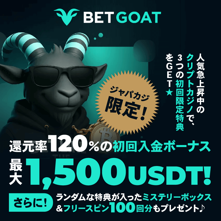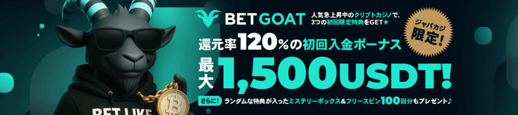 今、人気急上昇中の仮想通貨カジノ「ベットゴート(BETGOAT)」では、ジャパカジ限定のウェルカムボーナスとして還元率120%の初回入金ボーナス最大1,500USDTがもらえちゃいますっ(ノ◕ヮ◕)ノ*:・゚✧💰