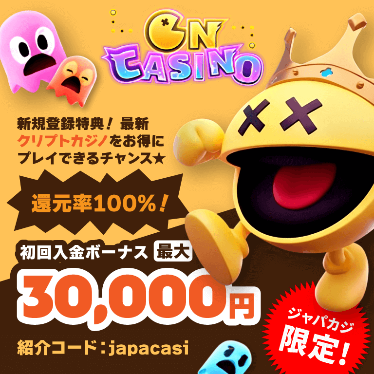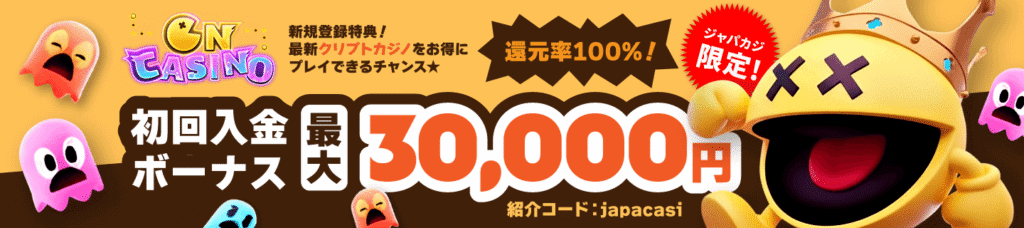 そんなオンカジノでは、ウェルカムボーナスとして還元率100%の初回入金ボーナスが、最大30,000円分獲得可能となっています!(/≧▽≦)/🎁✨